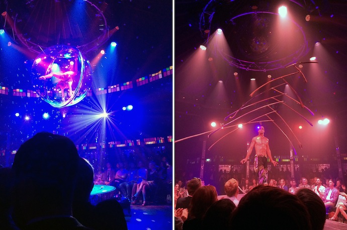 You can’t be desensitised inside the Spiegeltent. It is all just too close, too intimate. You can actually hear the artists hold their breath before a particularly difficult lift. You can see the sweat of effort trickling between their shoulder-blades. At one point, during which two acrobatic artists on roller-skates defied gravity in a terrifying spin, I whispered to Tons, “These seats may actually be a bit too good.” Because if just one thing went wrong, the both of them could have hurtled into our laps at 100 kilometres an hour.